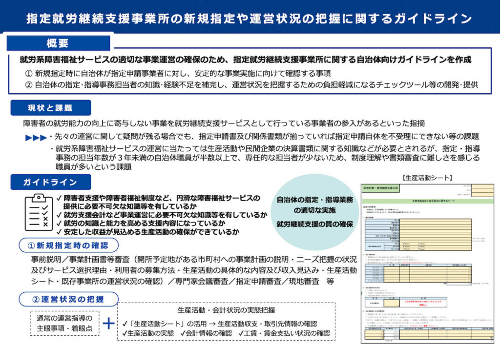 「障害者の就労能力の向上に寄与しない事業を“就労継続支援サービス”として行っている事業者の参入があるといった指摘がある中で、事業所の新規指定や運営状況の把握・指導の際に自治体が着目すべき観点を分かりやすく整理した」
