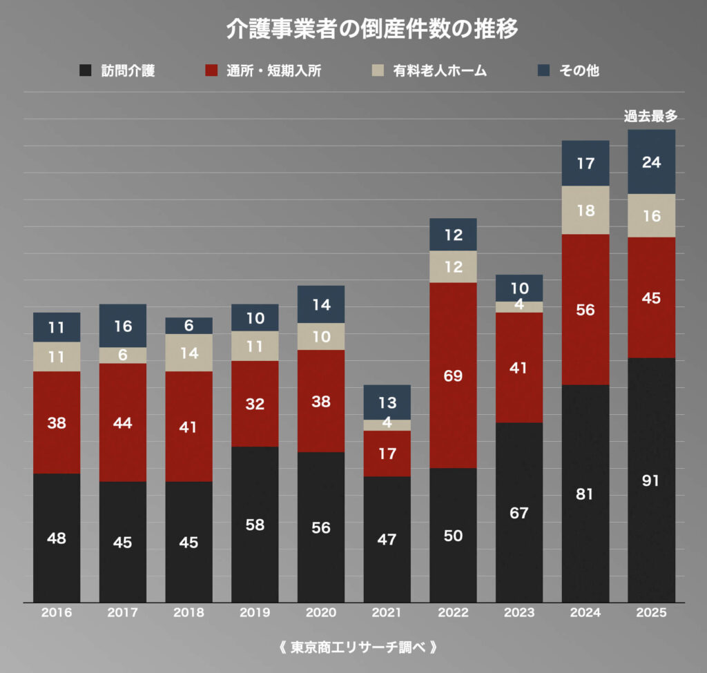 業態別では明暗が分かれた。「訪問介護」は91件と突出しており、3年連続で過去最多を更新。全体の件数を押し上げる主因となった。