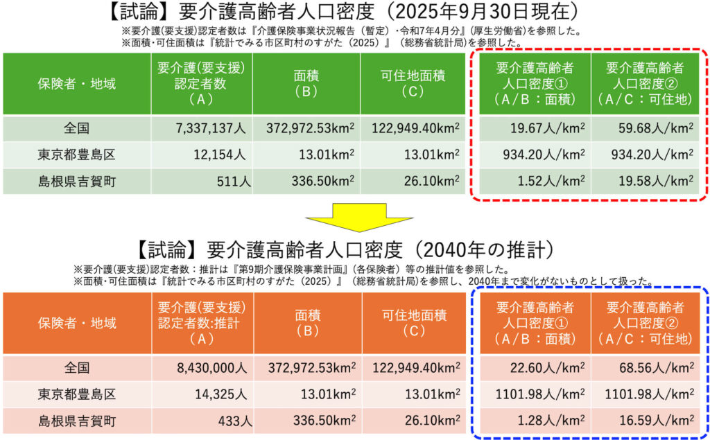 一方、島根県吉賀町については、総面積で割った場合はわずか1.52人/㎢、可住地面積で割っても19.58人/㎢です。1km四方に要介護高齢者は20人もいない地域(可住地面積の場合)ということになります。過疎の極みと言っても良いでしょう。