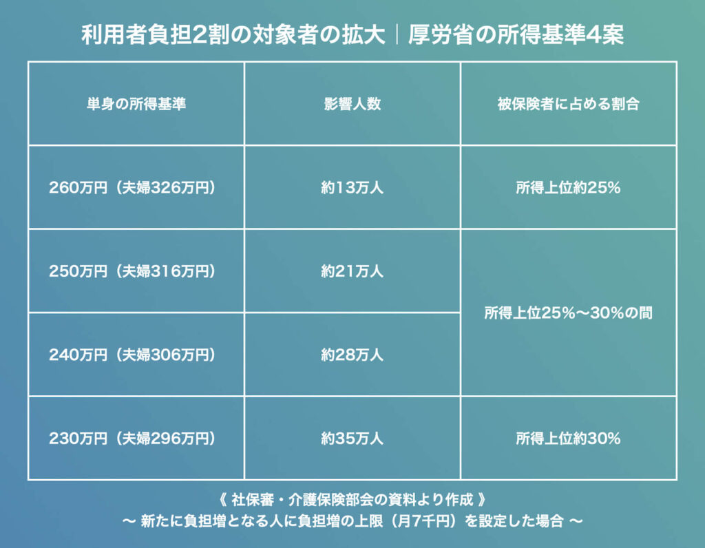 私は対象者の拡大が実行されると予測する。厚生労働省はいくつかの具体案を出している(以下の表を参照)が、対象者が最も多くなる単身で年収230万円以上の所得基準が採用される可能性が高いであろう。