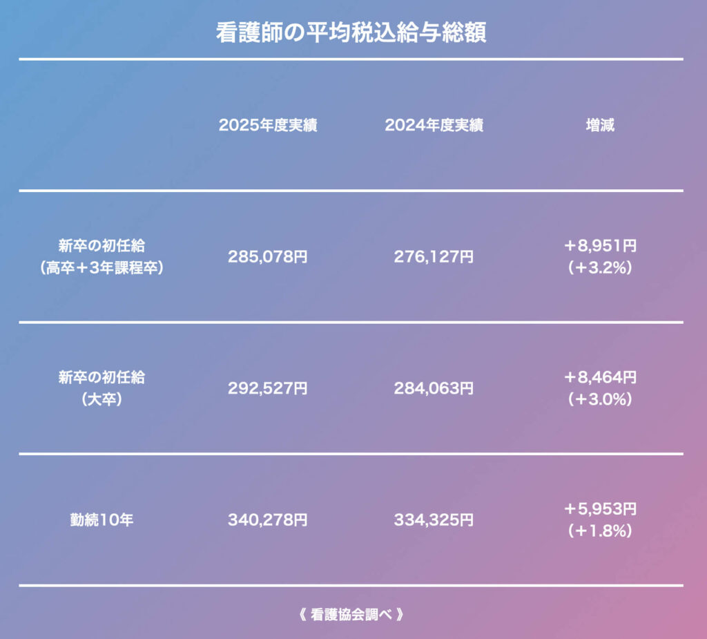 若者の給与も上がった。新卒看護師の平均税込給与総額をみると、大卒は29万2527円、高卒+3年課程卒は28万5078円となっている。