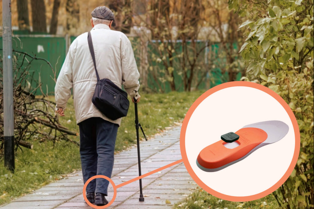 《 専用インソールに小型センサーを装着。日常の無意識下の歩き方を収集できる 》