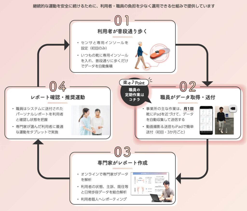 介護施設の職員は、煩雑な事務や入力作業などに労力を割く必要がない。追加人員の確保も不要。最小限の初期投資で取り組みを始められ、介護予防の質を高められる。