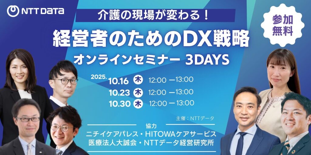 これらをどう乗り越え、未来に向けて持続的に成長できる経営モデルをどう築くか。その解を導き出すための無料オンラインセミナー「介護現場を変える! 経営者のためのDX戦略3Days」が、10月16日から始まる。