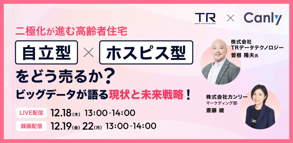 本セミナーの主な対象は、入居者獲得に課題を感じている介護事業者、新たな集客アプローチを模索している担当者など。「ホスピス型」と「自立型」、それぞれの潮流を読み解き、自社の営業戦略を見直すうえでこれ以上の材料はないだろう。