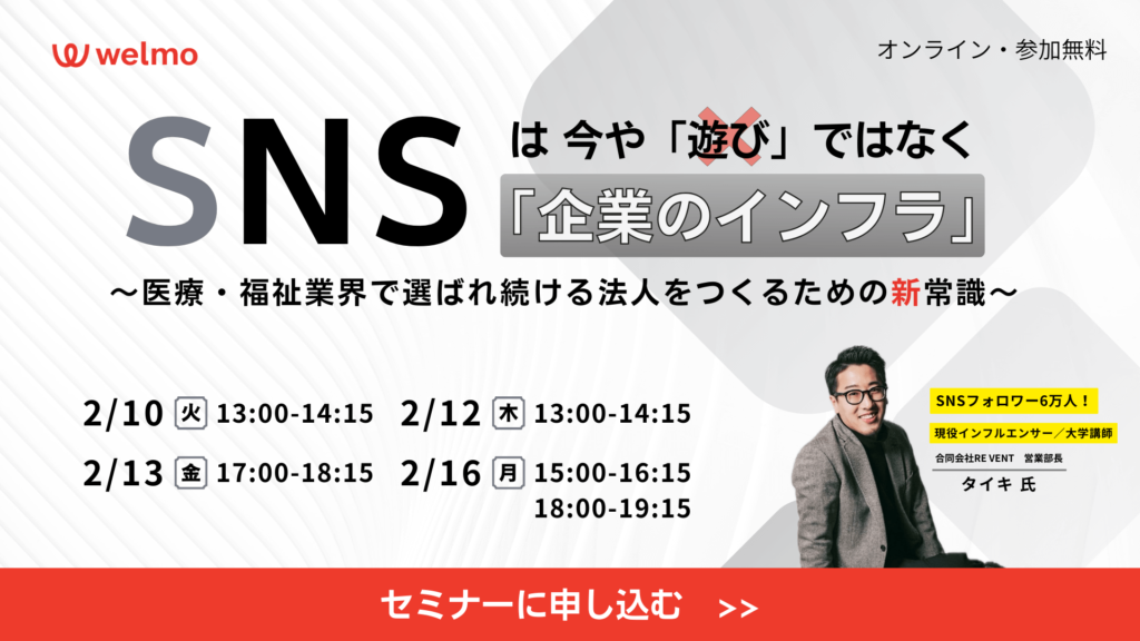 また、主催者である株式会社ウェルモは、医療・福祉現場の業務や働き方に向き合い、DXによって無理をしなくても業務が回る仕組みづくりを支援してきた。SNSで伝わる印象は、発信内容だけでなく、日々の業務の進み方や現場の余裕とも密接に結びついている。セミナー後半では、SNS活用の価値を高める前提として、経営として考えるべき業務整理やDXの視点についても、具体的に解説する。